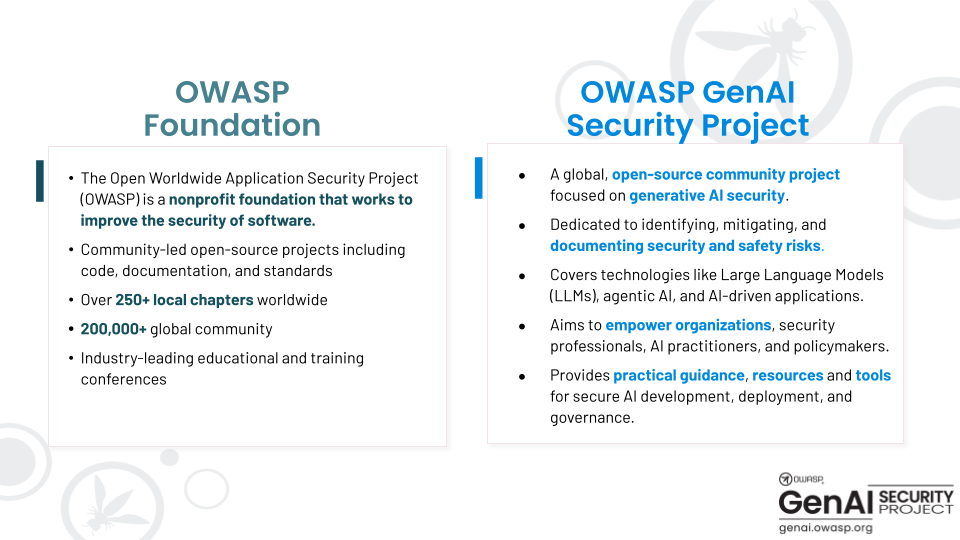 The OWASP Gen AI Security Project is a global, open-source initiative dedicated to identifying, mitigating, and documenting security and safety risks associated with generative AI technologies, including large language models (LLMs), agentic AI systems, and AI-driven applications. Our mission is to empower organizations, security professionals, AI practitioners, and policymakers with comprehensive, actionable guidance and tools to ensure the secure development, deployment, and governance of generative AI systems.