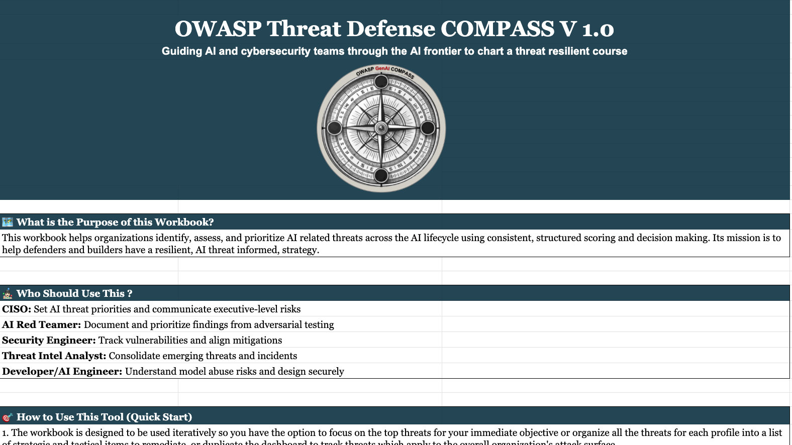 The OWASP GenAI Security Project’s Threat Defense COMPASS consolidates AI threats, vulnerabilities, defenses, and mitigations into a unified AI Threat Resilience Strategy Dashboard. COMPASS enables organizations to evaluate everything from external adversaries using AI tools to internal deployments of Microsoft Copilot, Google Gemini, and proposed GenAI or Agentic projects. Designed for iterative use, COMPASS serves as both a methodology and a practical spreadsheet tool that guides security teams through rapid threat prioritization and strategic decision making. The COMPASS is provided as a google sheet template.